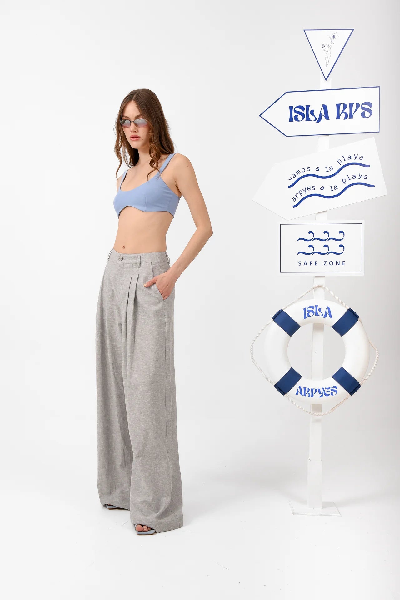 Kyma Pants feature a relaxed, wide-leg silhouette designed for effortless movement and comfort. They are crafted in lightweight fabric, high on the waist with front pleats, side pockets, belt loops, and a clean button closure. Elegant and versatile, they pair perfectly with the Kyma Blazer for a refined yet easy everyday look.