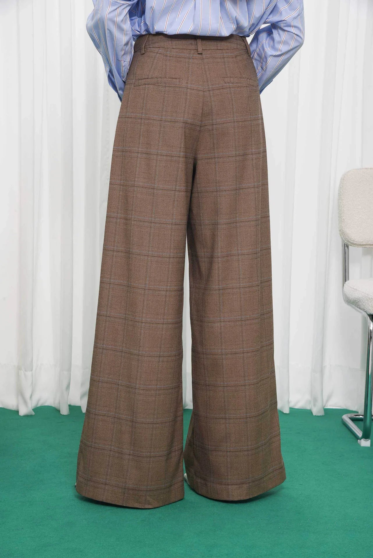 The Liberation pants are tailored from a soft plaid fabric blend in warm brown tones with fine blue lines. They feature a high-rise waist, pleated front, side and back pockets, and a wide-leg silhouette that drapes fluidly. Elegant yet comfortable, they pair perfectly with the matching blazer or trench coat.