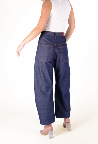 It reintroduces the classic high-waisted jean through a modern balloon silhouette with a bold, statement feel.
